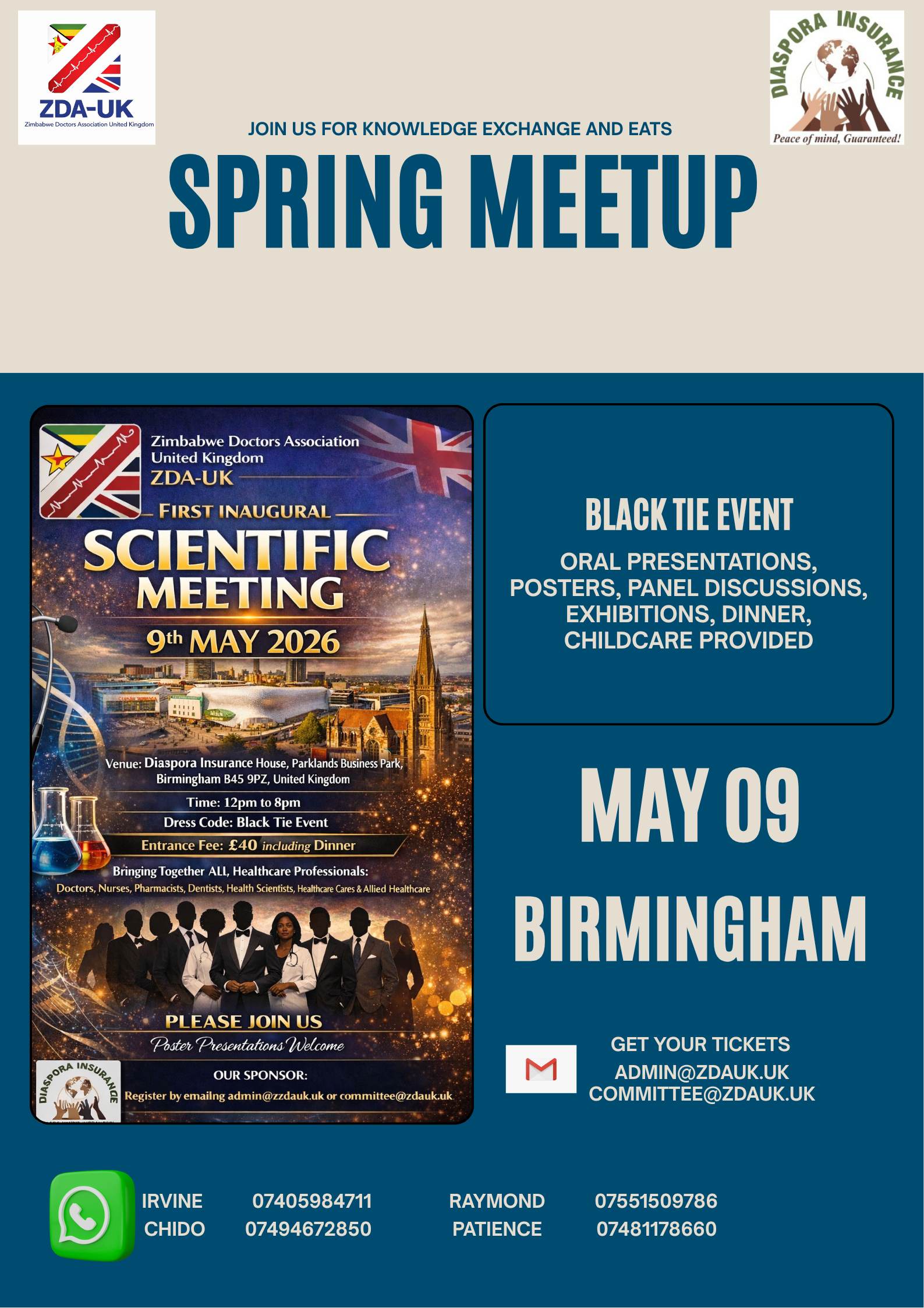 The Zimbabwe Doctors Association United Kingdom (ZDA UK) warmly invites healthcare professionals of Zimbabwean heritage, as well as friends of the diaspora, to our first-ever Scientific Meeting on Saturday, 9 May 2026 (12:00β20:00).